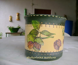Esqueci-me de tirar foto antes de começar o trabalho. A tábua estava bastante estragada e rachada e assim usei massa de tapar fendas e só depois lixei e dei o primário. Depois passei à fase da decoupage, pintura e envernizamento.